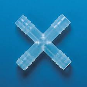 Tubing connector, PP, X-shape, for tubing, inner diameter 14 - 15 mm, total length 84 mm.