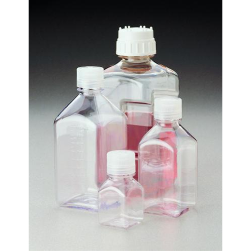 Bottiglia in PC. Tappo a vite in PP. Graduata con bordo rinforzato. Autoclavabile. Ideale per stoccare soluzioni acquose e per conservazione per tempi brevi di campioni di colture cellulari.