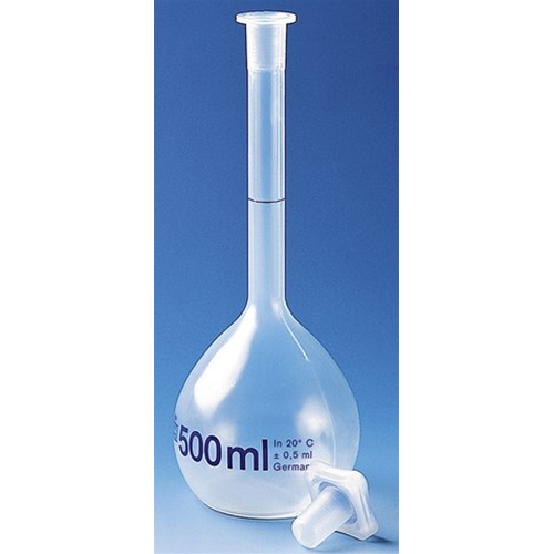 Volumetric flask, PMP (TPX) clear, 500 ml, NS 19/26, PP stopper
