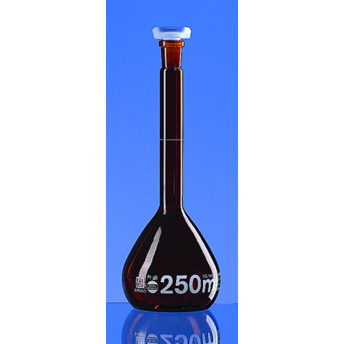 Volumetric flask, BLAUBRAND®, A, DE-M, 500 ml, Boro 3.3, NS 19/26, PP stopper, amber
