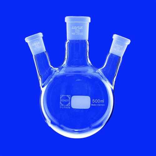 Palloni a fondo sferico con tre colli, angolati, con giunto in vetro smerigliato, DURAN, Capacità 500 ml, Pallone Ø 105 mm, Collo centrale 29/32 NS, Coni laterali 19/26 NS - Pz/Cf. 1