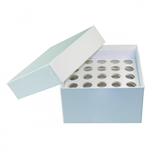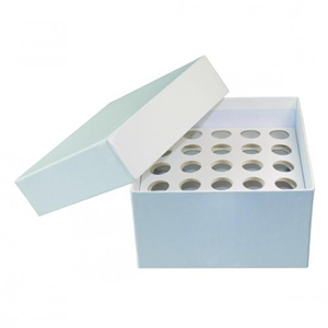 In cartone riciclabile di alta qualità repellente all'acqua. Con divisori interni per contenere fino a 25 provette da centrifuga da 5ml.