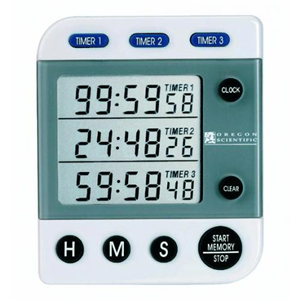 Conto alla rovescia e contasecondi. Allarme acustoco al raggiungimento dello zero. Funzione orologio 12 / 24 ore. Commutatore per volume allarme.
